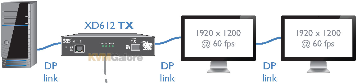 ADDERLink XD612 models use a single DisplayPort link to accept up to two video feeds from the host computer. This combined MST stream is then transferred to the receiver where an internal MST hub separates the two streams and presents them individually at the two video output ports.