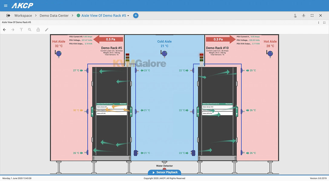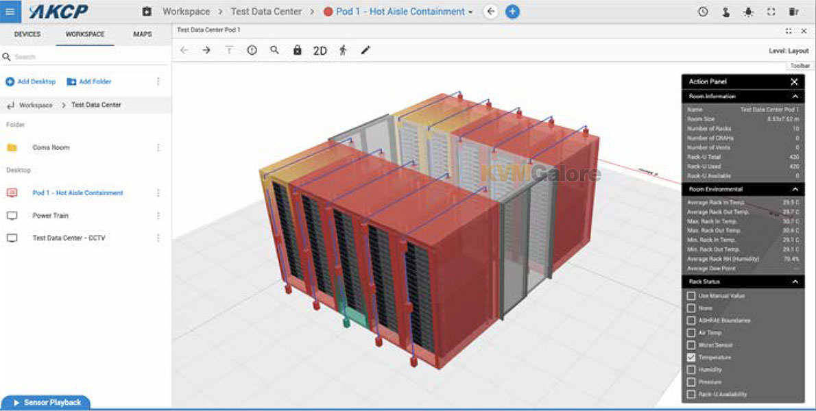 Quicklime monitoring for all your AKCP sensors. Manage sensor thresholds, alerts and reports. Customizable desktops to display sensor data with gauges, graphs, rack mapping and data center visualization through 2D and 3D maps. Close integration to AKCP thermal-map sensors displays rack inlet, outlet and △T values for each of your racks. Identify hotspots and cold spots in your data center.