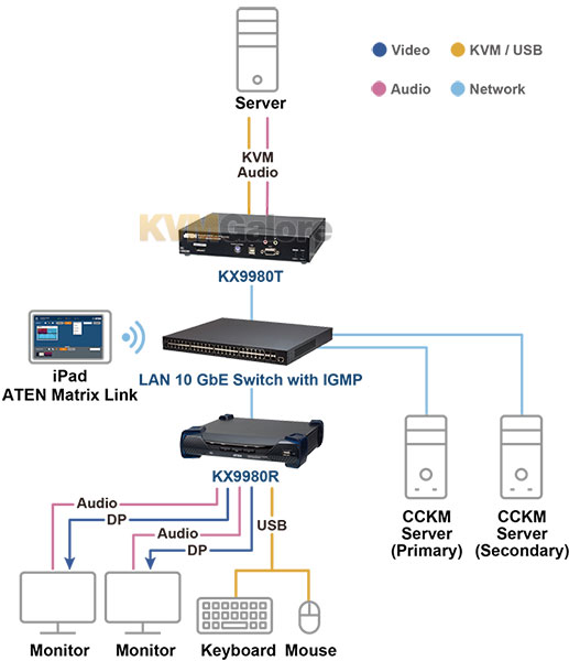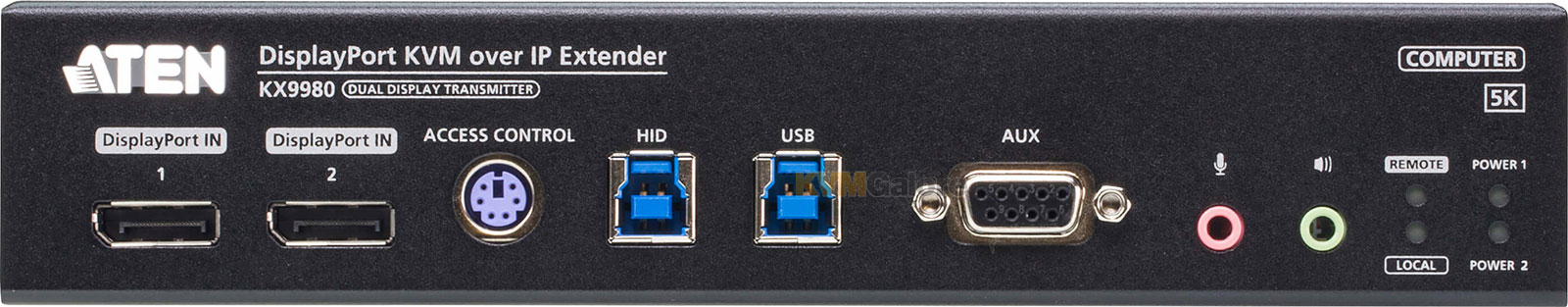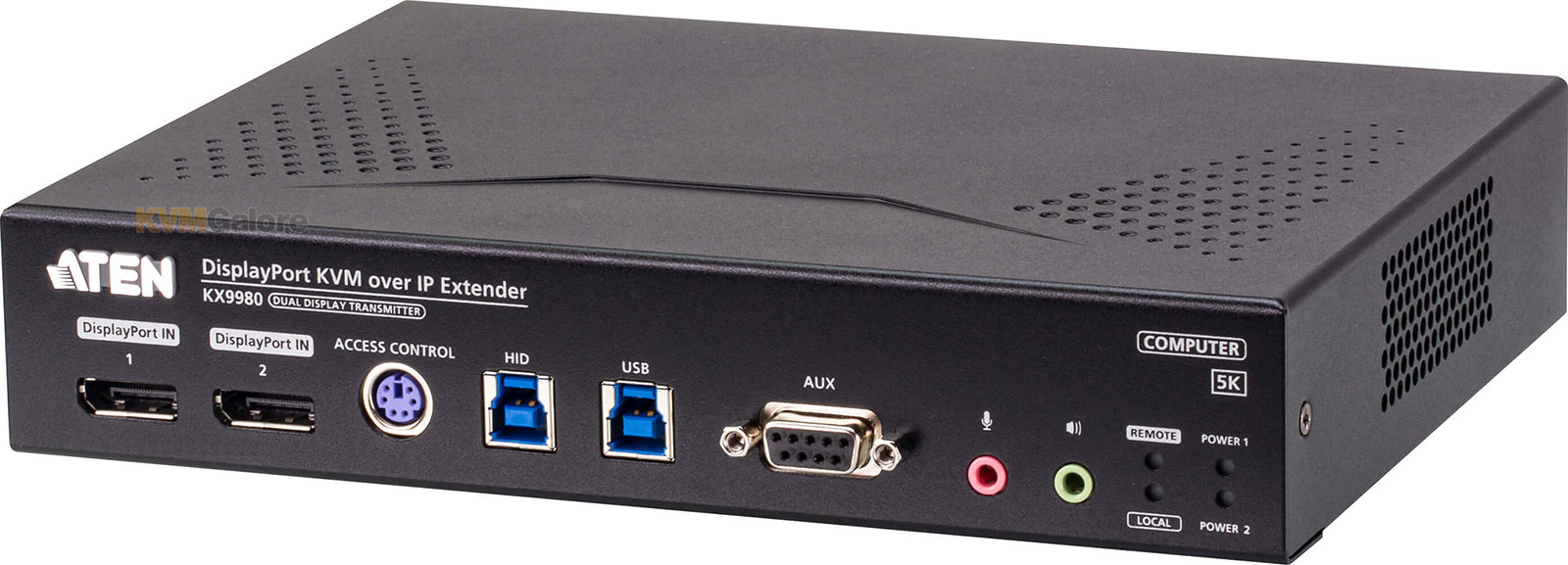 KX9980T high-performance IP-based 5K DisplayPort dual-display KVM over IP transmitter transmits a computer's keyboard, video, mouse, and USB signals to the receiver for providing separate console accesses from both the transmitter's and receiver's locations. The setup allows extended access to computer systems via a USB dual DisplayPort console (USB keyboard, USB mouse, dual DisplayPort monitors) over Intranet or a dedicated LAN, enabling users to place the computers in secure and temperature-controlled environments, which may be isolated from the user workstation.