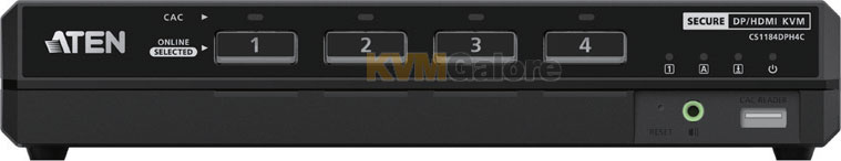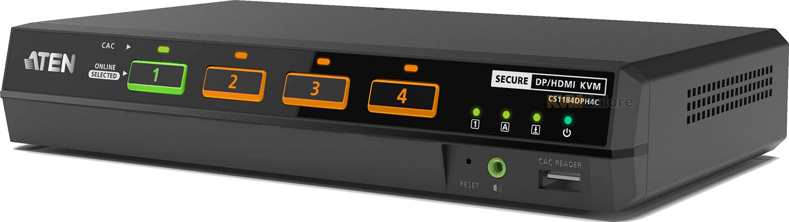 ATEN PSD PP v4.0 CS1144DPH4C universal secure KVM switch provides isolation between computer sources and peripherals while sharing a single keyboard, mouse, monitor, speaker set, and common access card (CAC) reader between connected computers of various security classifications.