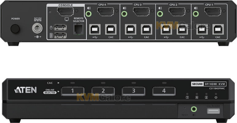 ATEN PSD PP v4.0 CS1184DPH4C universal secure KVM switch provides isolation between computer sources and peripherals while sharing a single keyboard, mouse, monitor, speaker set, and common access card (CAC) reader between connected computers of various security classifications.