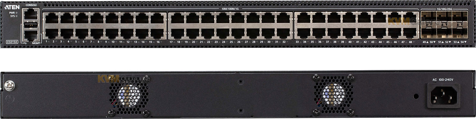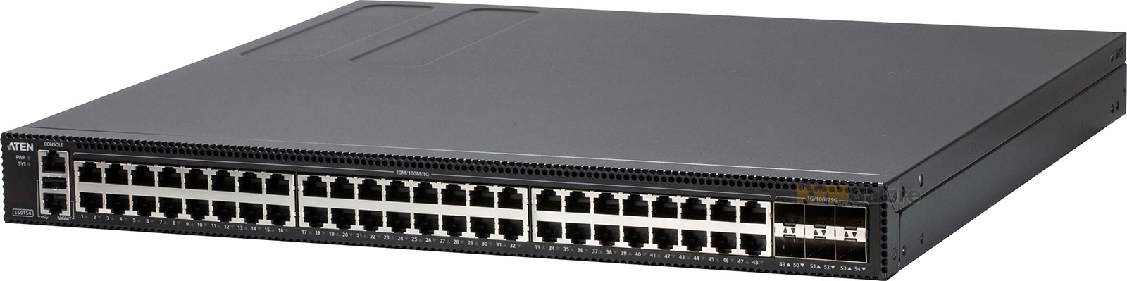 ES0154 54-port Layer 2+ gigabit Ethernet managed switch is ideal for installation with ATEN KVM over IP products. It simplifies the process of building OT infrastructure with the ATEN KVM over IP series by eliminating the complexities of setup. It provides a high-performance 54-port configuration, a complete array of L2+ features, and advanced functionalities including Layer 3 static route, DHCP server, IPv6 support, and LLDP, making it a versatile solution for enhancing network performance. It offers a combination of SFP28 (fiber) and RJ-45 (copper) ports for servicing a range of network needs.