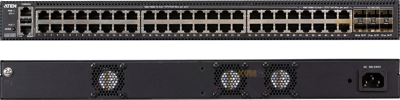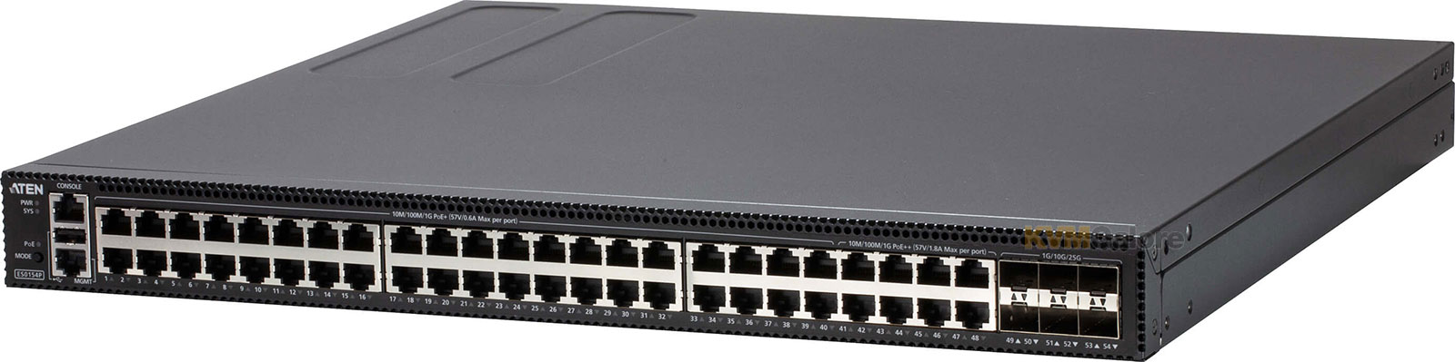 ES0154P 54-port Layer 2+ gigabit Ethernet managed switch is ideal for installation with ATEN KVM over IP products. It simplifies the process of building OT infrastructure with the ATEN KVM over IP series by eliminating the complexities of setup. It provides a high-performance 54-port configuration, a complete array of L2+ features, and advanced functionalities including Layer 3 static route, DHCP server, IPv6 support, and LLDP, making it a versatile solution for enhancing network performance. It offers a combination of SFP28 (fiber) and RJ-45 (copper) ports for servicing a range of network needs.