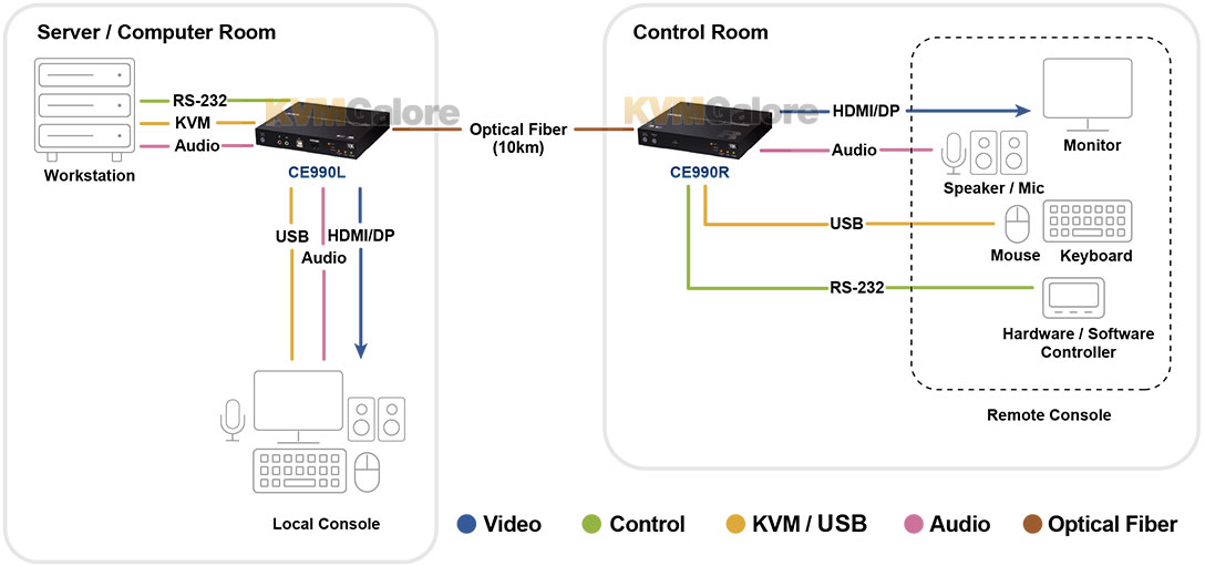 CE990 also extends keyboard / mouse control, RS-232, USB 2.0 data, and both stereo and embedded audio, including LPCM 7.1CH, Dolby TrueHD, Dolby Digital Plus, and DTS-HD Master Audio, over fiber optic cabling.