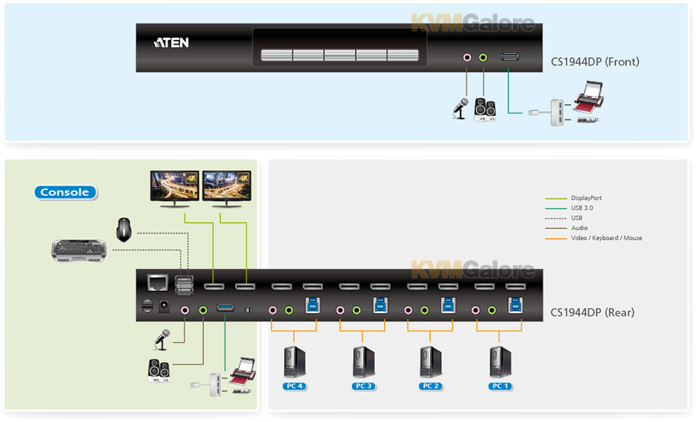 ATEN CS1944DP desktop KVM switch helps organize your desktop. Especially when managing a multimedia workstation at a large organization, CS1944DP provides you with instant access to two computers, all through a single USB keyboard, USB mouse and two DisplayPort monitors. CS1944DP 4-port USB 3.0 4K DisplayPort dual-display KVMP™ switch takes a giant leap forward in KVM switch functionality by combining a dual display KVM switch with a DisplayPort video interface, 2-port USB 3.1 Gen 1 hub and 2.1 channel audio support for rich bass in surround sound.