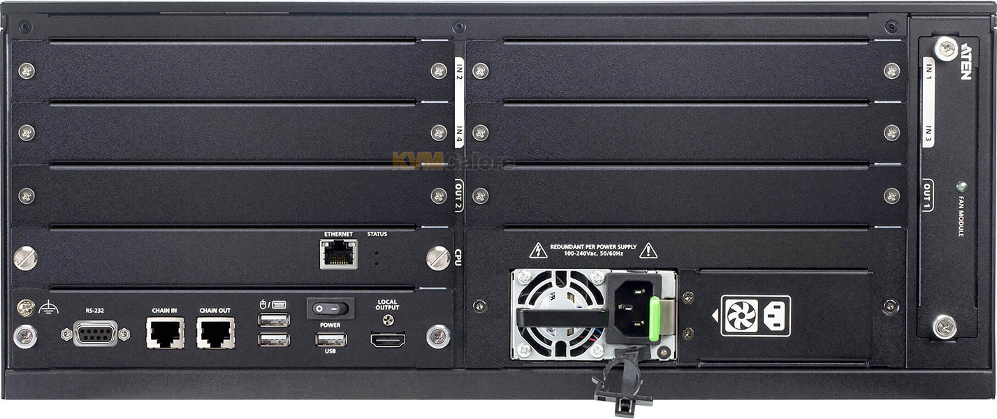 The VW1608's 4U chassis features 4 input and 2 output board slots, supporting 16 sources and 8 displays, with a modular design for easy upgrades. The redundant power modules and a hot-swappable cooling fan module ensure maximum uptime.