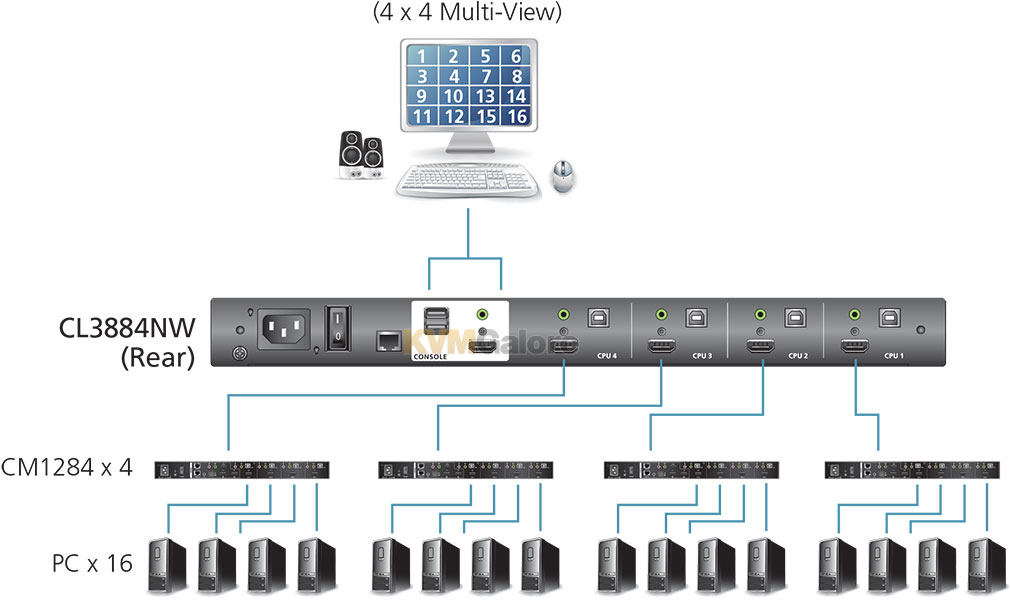 CL3884NW can be cascaded up to 2 levels to control 16 computers and support up to 4x4 Multi-View mode.