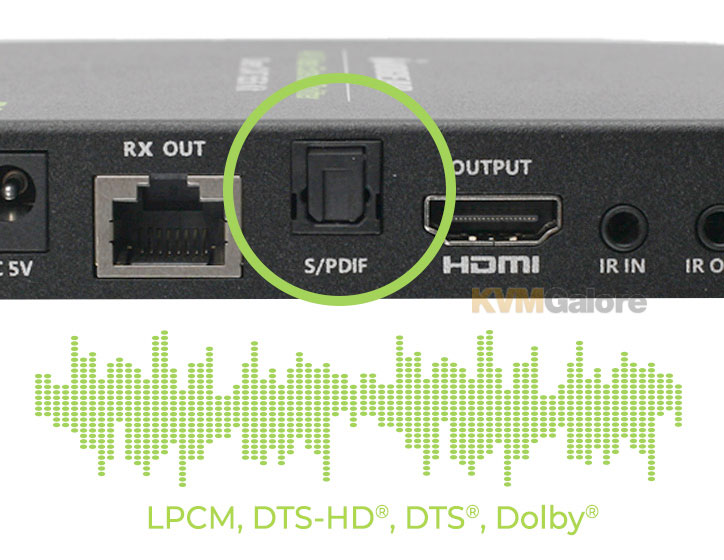 IOGEAR's 4K video extender/splitter kit includes the S/PDIF port to support LPCM, DTS-HD®, DTS®, Dolby® TrueHD 7.1, Dolby® Digital 5.1 audio formats. With the flip of a switch, select ARC for returning audio from compatible displays. An HDMI loop-out allows an additional display to be connected on the transmitter side.
