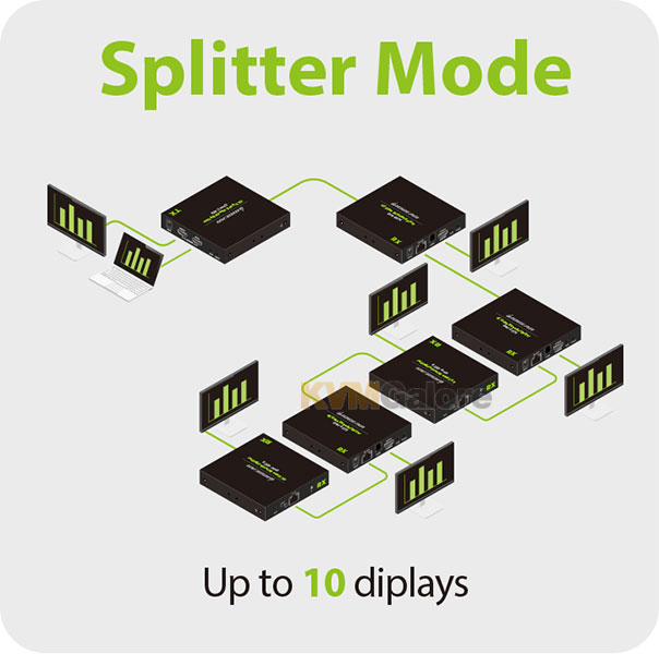 Splitter Mode: The major benefit of this mode is taking one source video and playing it on many receiving screens. For example, in an office/store setting, you have multiple monitors that need to play the same video and are rather far in distance from each other. Cascade up to 10 display devices with 10 receivers.
