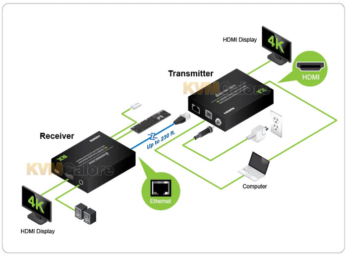 GCEH4K extends HDMI signals, including 4K @ 60Hz video and high-quality audio, over up 230 feet (70 m) of CAT-5e/6/6a cable.