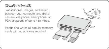 The 56-in-1 memory-card reader/writer works with all major memory card formats and supports high capacity: CompactFlash/Micro Drive, SD/SDHC/Mini SD/MMC, Olympus and Fuji Film flash memory, T-Flash/Micro SD/ Micro SDHC, Memory Stick/MS Duo, Memory Stick Micro (M2).