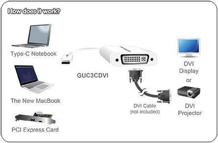IOGEAR's USB Type-C to DVI adapter is the ideal hardware solution to convert a USB-C connection to a DVI video output. This gives you the ability to connect yIOGEAR's USB-C based device like the Apple® MacBook®, Google® Chromebook Pixel™ and the Nokia™ N1 Tablet to any DVI based display or projector.