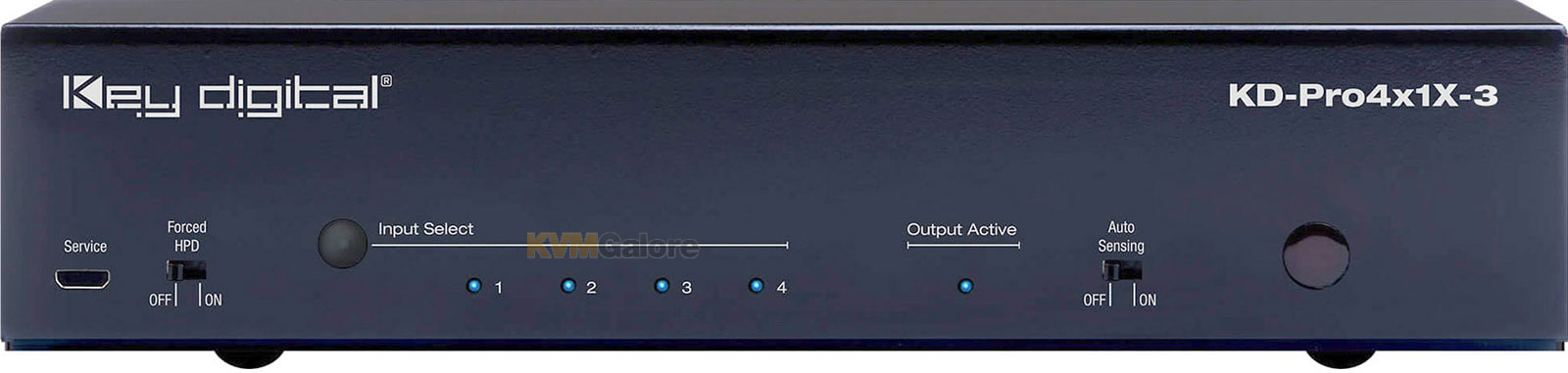 Key Digital® KD-Pro4x1X-3 is a 4K/18G HDMI switcher with analog and digital audio de-embedding, auto switching, web UI and iOS app-ready control.
