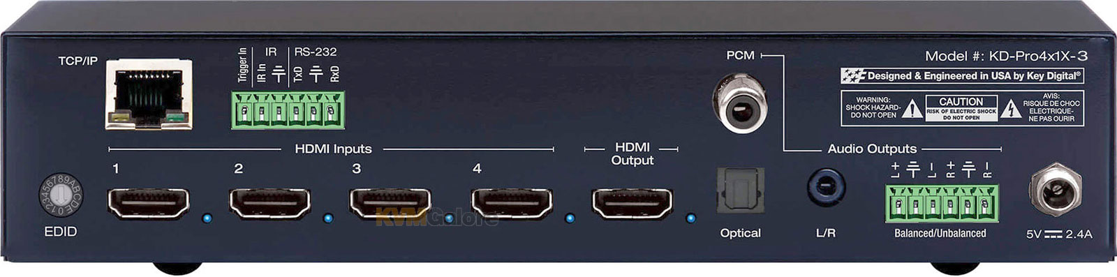 Designed for professional audio video installations in conference rooms, huddle spaces, classrooms, theater and gaming spaces, KD-Pro4x1X-3 enables multiple video sources to connect to a single video display while analog (3.5mm and balanced/unbalanced) and digital (optical and PCM) audio de-embed ports may feed audio of the selected source into and amplifier, DSP, or sound bar. KD-Pro4x1X-3 supports all SD, HD, VESA and Ultra HD/4K video standards with HDR header information included in a variety of 4K EDID handshakes.