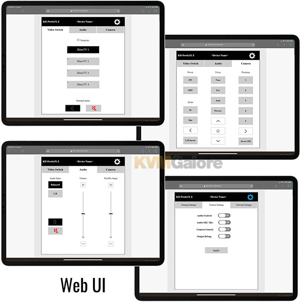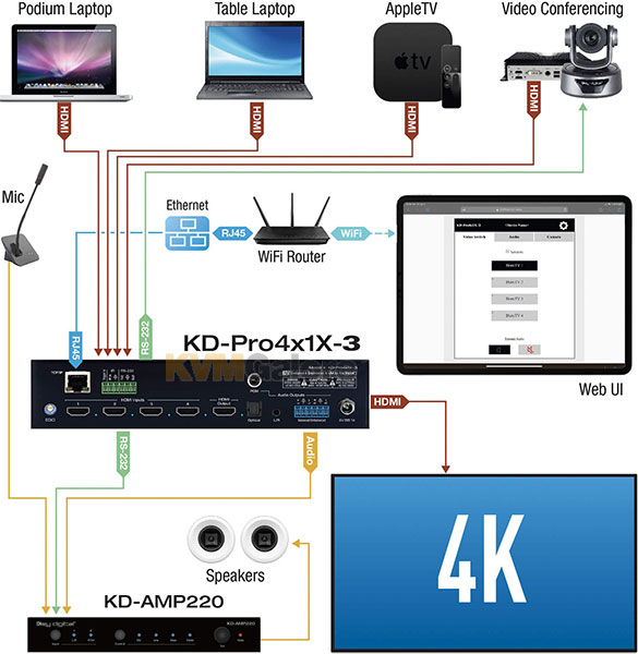 • Programming-Free Presentation System: Add KD-Amp220 and/or KD-CamUSB as desired and setup in KDMS Pro for a complete user interface in the web UI and KD iOS App including AV switching, volume control with microphone mix, and PTZ web cam control for an all-in-one user-friendly system