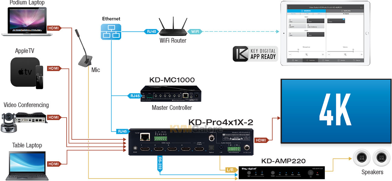 In addition to IR, RS-232, and TCP/IP control, KD-Pro4x1X-3 can also be controlled via trigger voltage and boasts a programming-free presentation system capability when integrated with KD-Amp220 and controlled via Web UI or free Key Digital iOS app.