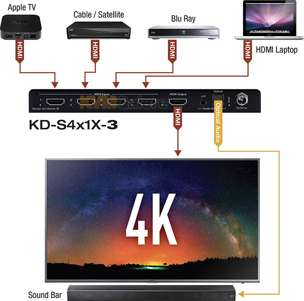 • HDMI Switching: 4 HDMI sources to 1 HDMI output/display