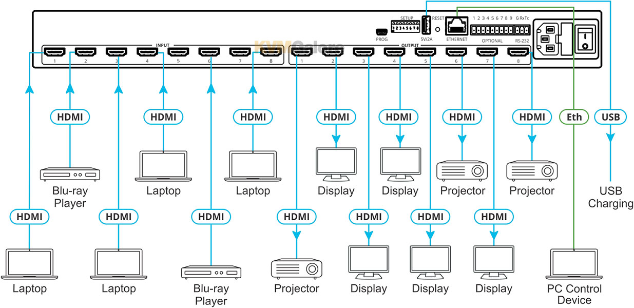 VS-88H2 is a high-quality matrix video switch with eight HDMI inputs independently routable to eight HDMI outputs. It supports integrated audio matrix; enables independent and flexible audio and ARC extraction, insertion and routing between any HDMI ports.