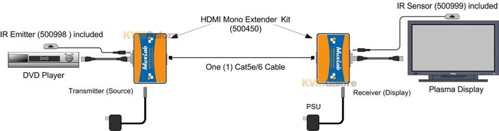 The HDMI extender 4K comes with one Transmitter and one Receiver as well as an IR emitter (500998) and IR sensor (500999) for remote control applications.