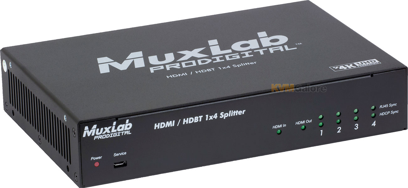 MuxLab's Ultra-HD/4K HDMI/HDBT 1x4 audio/video splitter is an HDBaseT splitter accepting one HDMI input signal and distributing it to 4 HDBaseT remote outputs, plus one HDMI output for local monitoring or for cascading up to four other splitters.