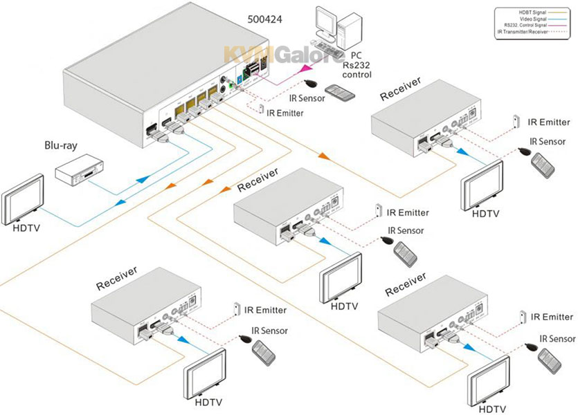 • Supports cascading via local HDMI output up to 4 times with additional 500424 splitters, including IR and RS232 cascading
