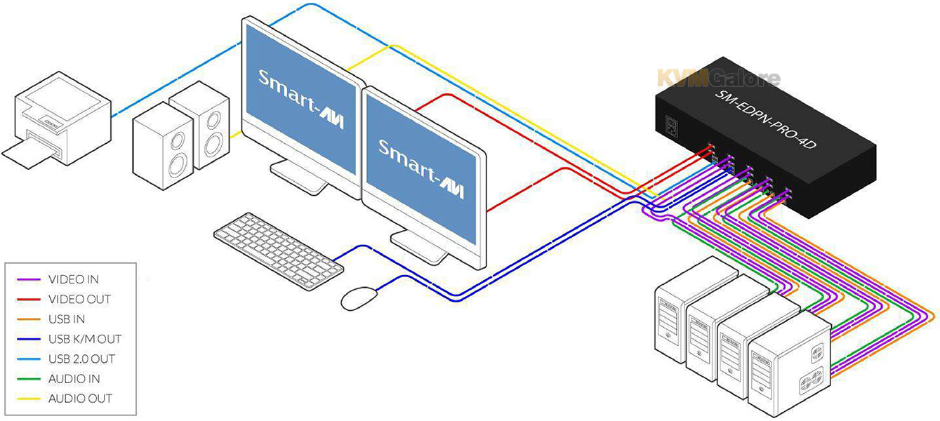 SM-EDPN-Pro supports independent simultaneous device selection. Foe example, it enables the use of a USB keyboard and mouse on one computer while audio and/or other USB peripherals such as scanners and printers are connected to a different computer source. SM-EDPN-Pro also maintains the ability to switch all connected devices to any one of the computer sources as with any other KVM switch in the market.