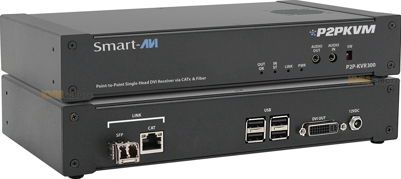 P2P-KVR300 Receiver, along with an accompanying Transmitter unit, extends your DVI-based workstation's console point-to-point or over an IP network (via a 1Gb Ethernet switch) up to 328 feet (100 m) per segment using CATx, up to 1640 feet (500 m) per segment using MultiMode fiber, or up to 6.2 miles (10 km) using SingleMode fiber.