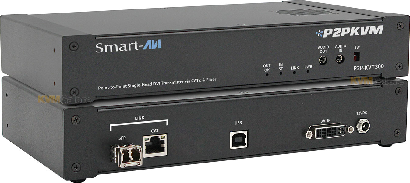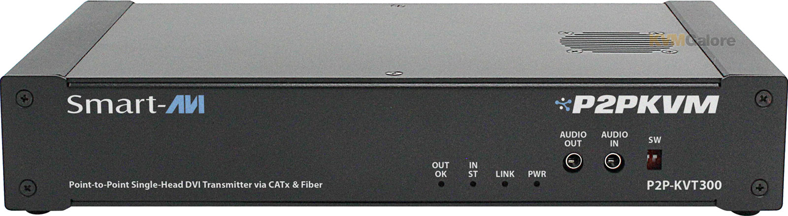 P2P-KVT300 Transmitter, along with an accompanying Receiver unit, extends your DVI-based workstation's console point-to-point or over an IP network (via a 1Gb Ethernet switch) up to 328 feet (100 m) per segment using CATx, up to 1640 feet (500 m) per segment using MultiMode fiber, or up to 6.2 miles (10 km) using SingleMode fiber.