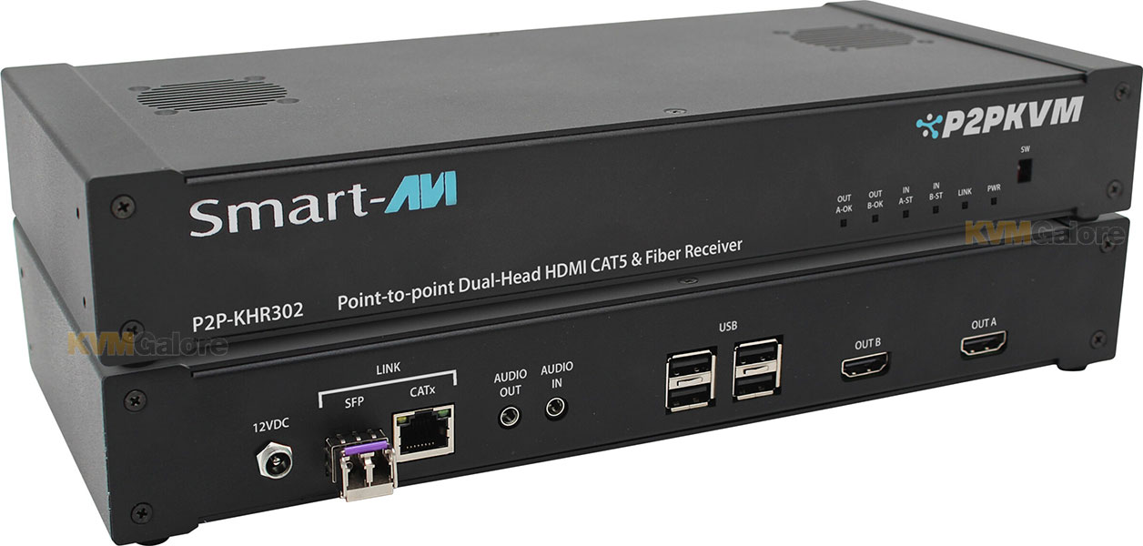 P2P-KHR302 Receiver, along with an accompanying Transmitter unit, extends your dual-head HDMI-based workstation's console point-to-point or over an IP network (via a 1Gb Ethernet switch) up to 328 feet (100 m) per segment using CATx, up to 1640 feet (500 m) per segment using MultiMode fiber, or up to 6.2 miles (10 km) using SingleMode fiber.