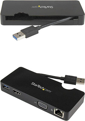 This travel docking station for laptops lets you transform your laptop or Ultrabook™ into a mobile workstation. It adds HDMI® or VGA video output, a USB 3.0 port and a Gigabit Ethernet RJ45 port,all through a single USB 3.0 host connection.